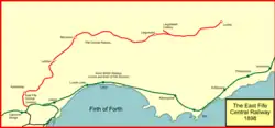 The area of land inland from the coast at Methil and Leven, known as the Riggin o Fife, had also been the scene of coal extraction in the past, but its remoteness from the harbours and the poor roads made the work unprofitable. Nonetheless the wealth of the East Fife coalfield encouraged prospecting, and reports were obtained assuring a good seam of coal at Lochty, about five miles north west of Anstruther: a 40-inch seam of good quality coal at 10 fathoms. A railway was essential to the exploitation of the mineral, and a meeting was held in Edinburgh on 19 October 1892 to propose it. As well as the coal, the agriculture of the district would benefit from a railway, and those present were positive towards paying for further surveys. The railway would connect with the Leven and East of Fife line (now in NBR ownership) forming a triangle of lines there, then running north east and forking to join the NBR main line north of Cupar, and through Lochty to join the Anstruther to St Andrews line near Stravithie. Further rich coal seams aggregating to 60 feet were said to be under the line of route. The Parliamentary Bill for the line, to be known as the East Fife Central Railway, was deposited in January 1893; it proposed share capital of £250,000.[1]