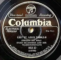 "East St. Louis Toodle-Oo" (also "Toodle-O" and "Todolo") is a composition written by Duke Ellington and Bubber Miley and recorded several times by Ellington for various labels from 1926–1930 under various titles.[1] This song was in 1927 the first charting single for Duke Ellington and was one of the main examples of his early "jungle music".[2] The composition entered the public domain in the United States on January 1, 2023.[3]