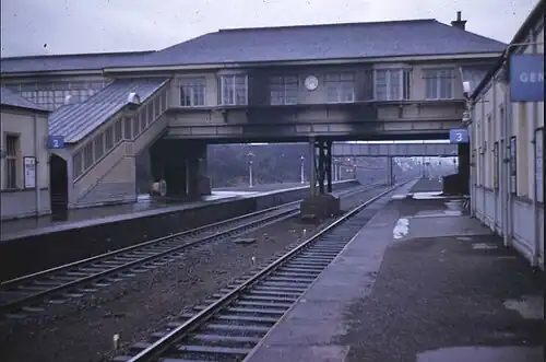 The station opened on 21 July 1840.[1] The station was grand in design, and had four platforms, with the station building extended out over the two central platforms. It had a covered walkway out into Elderslie Main Road. It was a busy railway intersection, as all mainline traffic from Glasgow - Ayr/Stranraer passed through it, as well as the Paisley Canal Line, the Dalry and North Johnstone Line, and the Bridge of Weir Railway.[2] To the east of the station was Canal Junction, with the line dividing between the line to Glasgow via Paisley Gilmour Street and the line via Paisley Canal; whilst to the west a dive-under junction provided connections to the North Johnstone line and the line to Greenock Princes Pier, via Kilmacolm.