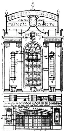 The theatre was designed by Kaberry and Chard,[1][2] and built by R. P. Blundell as a music hall for a syndicate led by leading bookmaker Rafe Naylor.[3] The site was a 150 by 130 feet (46 m × 40 m) block on the Bijou Lane corner of Quay Street ("Saunders' Corner"[a]), Railway Square, near the side entrance to Central Station. It opened on 1 May 1927 with the new Jerome Kern musical Sunny, followed by The Student Prince.[4]