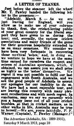 An English cricket team toured Australia in 1911–12. It was led by Plum Warner, but Johnny Douglas took over the captaincy for all five Test matches when Warner fell ill early in the tour. Despite losing the first Test at Sydney, a side which included Jack Hobbs, Frank Woolley, Sydney Barnes and Wilfred Rhodes hit back to win the remaining four Tests. They thus regained The Ashes.