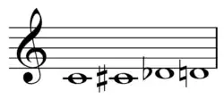 In music theory, an enharmonic scale is a very ancient Greek musical scale which contains four notes tuned to approximately quarter tone pitches, bracketed (as pairs) between four fixed pitches.[4] For example, in modern microtonal notation, one of the several enharmonic scales aligned with the conventional key of C major would be