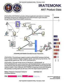 F-Secure claims that the Equation Group's malicious hard drive firmware is TAO program "IRATEMONK",[15] one of the items from the NSA ANT catalog exposed in a 2013 Der Spiegel article. IRATEMONK provides the attacker with the ability to have their software application persistently installed on desktop and laptop computers, despite the disk being formatted, its data erased or the operating system re-installed. It infects the hard drive firmware, which in turn adds instructions to the disk's master boot record that causes the software to install each time the computer is booted up.[16] It is capable of infecting certain hard drives from Seagate, Maxtor, Western Digital, Samsung,[16] IBM, Micron Technology and Toshiba.[6]