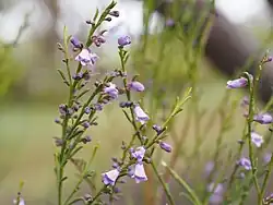The flowers are borne in groups of 3 to 5 in leaf axils on a stalk which is 2–5 mm (0.08–0.2 in) long and sticky when young. There are 5 overlapping, egg-shaped to lance-shaped, brownish sepals which are 2–3.5 mm (0.08–0.1 in) long. The sepals are glabrous except for the long hairs on their edges, are sticky and remain on the plant long after flowering has finished. The petals are 5–9 mm (0.20–0.35 in) long and joined at their lower end to form a tube. They are a shade of violet to lilac-coloured, rarely white on the outside and white with violet spots inside the tube. The petal lobes are hairy on the outside and have short, flattened hairs on the inside. The petal tube is mostly glabrous on the outside while the inside of the tube is filled with long, spidery hairs. The 4 stamens are fully enclosed in the petal tube. Flowering occurs from August to November and is followed by fruit which are oval-shaped, hairy and 2–3 mm (0.08–0.1 in) long.[2][3][5]