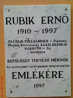 Ernő Rubik (27 November 1910 in Pöstyén, Austria-Hungary, now Piešťany, Slovakia – 13 February 1997) was a Hungarian aircraft designer and father of Ernő Rubik, the architect who became famous for his mechanical puzzles (e.g. the Rubik's Cube).