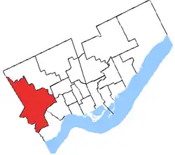 It consisted of that part of Metropolitan Toronto bounded as follows: from the intersection of Dundas Street West and Jane Street, north along Jane Street, west along Eglinton Avenue West, northwest along the Humber River, west along Dixon Side Road, north along Islington Avenue North, west along Rexdale Boulevard, north along Kipling Avenue North, northwest along the West Branch of the Humber River, south along the boundary between the Townships of Etobicoke and Toronto, northeast along the Queen Elizabeth Way, north along Kipling Avenue South, and northeast along Dundas Street West to Jane Street.