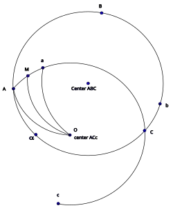 Now A is on the initial circle (the blue circle), so its image will be on the transported circle (red). He labels that image as point a. Since A is also on the transported circle (red), it is the image of another point that was on the initial circle (blue) and he labels that preimage as α (see Figure 2). Then he considers the two arcs joining α and a to A. These arcs have the same length because arc αA is mapped onto arc Aa. Also, since O is a fixed point, triangle αOA is mapped onto triangle AOa, so these triangles are isosceles, and arc AO bisects angle ∠αAa.