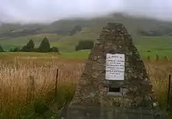 Memorial cairn near the graveyard which is in front of the trees to the left..