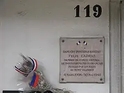 Plaque in memory of Félix Cadras at 119 Boulevard Davout, Paris 20th arr, where he lived under a false name during World War II
