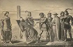 After the speech, the Archbishop of Toledo removed the crown from the effigy, which was the symbol of royal dignity. Then Plasencia took the sword, symbol of administration of justice, and Benavente took the staff, symbol of government. Finally, Diego López de Zúñiga, brother of Plasencia, tore down the statue, saying "To the ground, bitch!" (¡A tierra, puto!).[3]