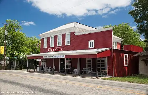 A former precinct courthouse, sits in the town square with extra wide 100-foot (30 m) curbed streets on its borders as specified in the original 1850 plat. Bounded by Main, Washington, Live Oak and Fayette streets the town square is the focus of commercial development. The remainder of the town is primarily residential. Typical commercial construction is wood frame block buildings many featuring false front parapets and awnings. Residential construction is typically modest single family homes on generous lots.[2]