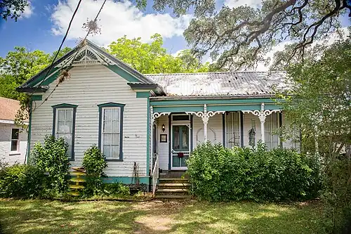 The Fayette County Precinct No. 2 Courthouse, built in 1880 is wood-frame construction with horizontal wood siding and has a simple two story square plan. The south elevation is the facade with simple wood stairs and solid wood panel double doors. Windows are symmetrically placed with three bays on the north and south, and two on the east and west.[2] Construction of the Victorian style building was funded by US$600 (equivalent to $19,550 in 2024) in contributions from the citizens of Fayetteville and an additional US$200 in tax funds from the County Commissioners' Court. Funding for painting the building was raised by holding a ball. A calaboose (holding jail) with two cells was finished in 1887.[3] A clock tower, financed by a ladies club, was added in 1934 in the center of the hipped roof.[2][3] It is no longer used as a courthouse. Precinct courthouses were quite rare in early Texas and this one was listed as an RTHL in 1997.[2] The other government building, the post office, is not considered historical, dating from the late 1960s.[2]