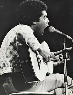 In third place for the national phase was "Carolina", written by Chico Buarque and performed by sisters Cynara and Cybele of Quarteto em Cy. Buarque had only entered the competition under the condition that a fine he incurred from Walter Clark for breaching a contract earlier that year would be waived and was surprised to have placed so high.[28] Meanwhile, Nascimento earned second place with "Travessia" and received the special designation of best performer. Record producer Creed Taylor, who was in attendance, was so impressed by Nascimento that he immediately signed him to his label for a three-album deal, beginning with Courage.[29] The national phase was won by the song "Margarida", written and performed by Guttemberg Guarabyra alongside his band, Grupo Manifesto. The song (based on "Seche tes Larmes, Marie", a French folk tune) was another crowd favorite and was chosen by the jury for its unique structure that allowed the audience to sing along even during its debut performance.[30]