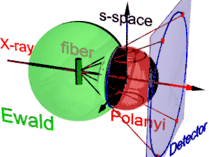 The animation shows the geometry of fiber diffraction. It is based on the notions proposed by Michael Polanyi. Reference direction is the primary beam (label: X-ray). If the fiber is tilted away from the perpendicular direction by an angle β, as well the information about its molecular structure in reciprocal space (trihedron labelled s-space) is tilted. In reciprocal space the Ewald sphere has its center in the sample. Its radius is 1/λ, with λ the wavelength of the incident radiation. On the surface of the Ewald sphere all the points of reciprocal space are found that are seen by the detector. These points are mapped on the pixels of the detector by central projection.