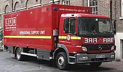 The vehicle carries equipment to support normal fire appliances and crews, typically at prolonged or major incidents.