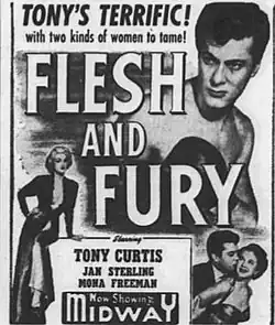 Flesh and Fury is a 1952 American film noir drama sport film directed by Joseph Pevney and starring Tony Curtis, Jan Sterling and Mona Freeman.[1]