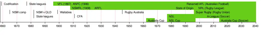 The following gives a summary of each football code by state/territory, along with foundation dates and summaries. (Some Australian colonies, early in their history, for example South Australia and Tasmania), had football competitions and clubs as early as the 1840s but played what are now defunct codes and later adopted one of the existing codes.) This also includes the earliest dates for areas where a code was dormant for long periods of time (such as Australian rules in New South Wales and Queensland and rugby in Tasmania). Highlighted dates for the earliest code established in that territory (not an indication of current popularity). Although Rugby league began in 1908, as a breakaway from rugby union, with most of its following initially coming from that code.