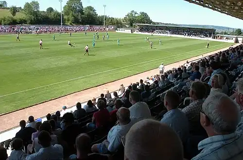 In 2004–05 Forest Green finished in the relegation zone, but were reprieved after Northwich Victoria were demoted due to issues with their stadium.[9] In 2007–08 the club defeated Football League opposition in the FA Cup for the first time, beating Rotherham United 3–0 in a first round replay, before losing 3–2 at Swindon Town. The following season saw them reach the third round of the Cup for the first time, beating Team Bath and then Rochdale to set a third round tie at home to Derby County which they lost 4–3 in front of a record crowd of 4,836.[1] Another third round appearance in 2009–10 ended with a 2–1 defeat at Notts County.[6]