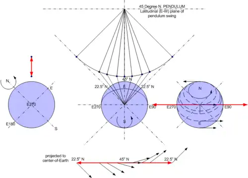 For the equatorial pendulum with a swing in the longitudinal (north-south) direction the surface velocity vectors on either side of the swing are balanced in the same direction and the center-point of the pendulum swing is moving along with the direction of rotation (see Figure 2A).
