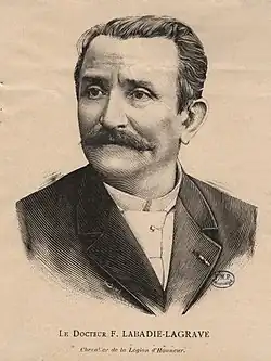 Born at Nérac (department of Lot-et-Garonne), Labadie-Lagrave studied medicine in Paris. During the Franco-Prussian War, while still a resident, he saved a large convoy and was decorated on the battleground at Metz. He took his doctor's degree in 1873. In 1879 he became médecin des hôpitaux in Paris, practicing notably at the Charité hospital.[1]