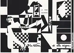 In 1981, Francis Bernard creates a graphic series based on the character Père Duchesne. This will be shown for two months at the Centre Pompidou in Paris.[2] The series is a collection of 150 drawings and paintings and constitutes the « Théâtre pictural du Père Duchesne ». It is inspired by the Jean-Pierre Faye play, Les dernières journées du père Duchesne, which uses historical material from the revolutionary newspaper Le Père Duchesne. Twenty two panels of this series are also presented at the French-Italian Cultural Center, during the biennial Venice carnival on the theme "The masks of Marat".