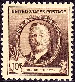 Frederic Sackrider Remington (October 4, 1861 – December 26, 1909) was an American painter, illustrator, sculptor, and writer who specialized in the genre of Western American Art. His works are known for depicting the Western United States in the last quarter of the 19th century and featuring such images as cowboys, Native Americans, and the US Cavalry.[1]