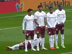 - when a free kick is taken, an attacking player is less than 1 m (1 yard) from a "wall" formed by three or more defending players[19]