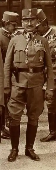 Lukachich distinguished himself as a competent officer during the Serbian campaign in World War I.[6] On the Italian front of the war he fought at the Battle of Drina, Battle of Doberdò, Battle of Caporetto, and the Battles of the Isonzo. Géza was said to have fought valiantly while commanding the 20th Landwehr Division at the Eleventh Battle of the Izonzo.[6][7] Earning him the Officer's Gold Knight's Medal. On 10 March 1915 he was promoted to major general.[3] In November 1916 he was transferred to the Russian front. Later in the same year, he was selected to lead the 20th Landwehr Division,[3][5] and returned to the Italian front in August 1917.[3] On 17 August 1917, Lukachich von Somorja was awarded the Order of Maria Theresia, and with it the title of Baron of Somorja.[4] During the early days of 1918, he was put in charge of many garrisons throughout Hungary and promoted to Feldmarschalleutnant on 9 March 1918.[3]
