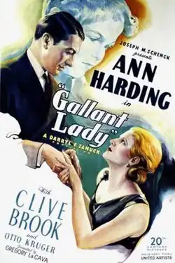 Gallant Lady is a 1934 American pre-Code drama film directed by Gregory La Cava and starring Ann Harding, Clive Brook and Otto Kruger. It was a production of Darryl F. Zanuck's independent company Twentieth Century Pictures. The film was released on January 5, 1934, by United Artists.[1][2][3] It was a commercial and critical success on its release.[4] It was remade in 1938 as Always Goodbye with Barbara Stanwyck and Herbert Marshall.[5]