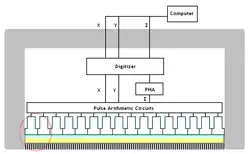 The location of the interaction between the gamma ray and the crystal can be determined by processing the voltage signals from the photomultipliers; in simple terms, the location can be found by weighting the position of each photomultiplier tube by the strength of its signal, and then calculating a mean position from the weighted positions.[2]: 112  The total sum of the voltages from each photomultiplier, measured by a pulse height analyzer is proportional to the energy of the gamma ray interaction, thus allowing discrimination between different isotopes or between scattered and direct photons.[6]: 166