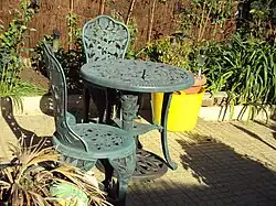 Garden furniture, also called patio furniture or outdoor furniture, is a type of furniture specifically designed for outdoor use. It is typically made of weather-resistant materials such as aluminium which is rust-proof.[1][2]