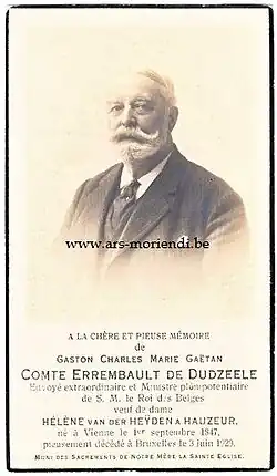 Gaston-Charles-Marie-Gabriel-Raphaël-Gaëtan, comte Errembault de Dudzeele (Vienna 1 September 1847 – Ixelles 3 June 1929) was a Belgian nobleman and a diplomat.