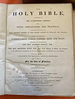 - an annotated bible, prepared with Richard Mant for the Society for Promoting Christian Knowledge ("D'Oyly and Mant's Bible") (1st edition, 1814, &c.; 2nd edition, 1817; 3rd edition, 1818);