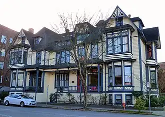 The George H. Williams Townhouses, commonly known as "The Lawn" apartments,[3] located in northwest Portland, Oregon, United States, are listed on the National Register of Historic Places.[4] The three-unit townhouse structure was built for, and originally owned by, George Henry Williams,[3] a former United States Attorney General, United States Senator (for Oregon), and Oregon Supreme Court Chief Justice. Later, Williams also served as mayor of Portland. The townhouses were built as a business investment, and Williams did not reside in the building. The structure was moved in 1922. Although always situated within the block bounded by NW 18th and 19th Avenues, and NW Couch and Davis Streets, it was originally in the block's northwest corner, i.e. at the southeast corner of the intersection of NW 19th and Davis. In 1922, it was moved east within the same block, to the corner at NW 18th and Davis.[3]