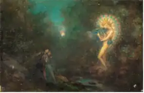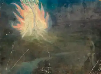 He claimed to see nature spirits and made paintings about them, such as the sídhe, elven or faerie beings in Irish folklore.[19][20] On one occasion, he showed some drawings he had made of them to a peasant, who would have pointed out that he had already seen many of those entities.[20] In 1889 he had traveled with W. B. Yeats to a town in County Galway, where Russell also painted these spirit beings, and a Druid is said to have appeared to them in vision.[21] The previous year, in a letter to Yeats, Russell had stated: