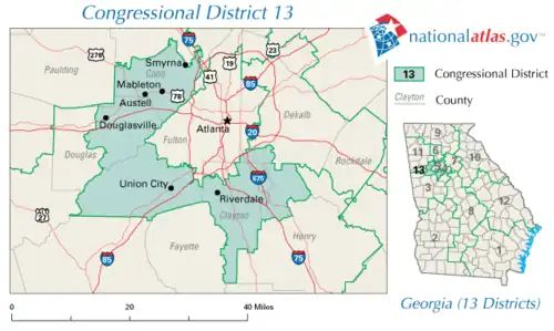 Georgia's 13th congressional district is a congressional district in the U.S. state of Georgia. The district is currently represented by Democrat David Scott, though the district's boundaries have been redrawn following the 2010 census, which granted an additional congressional seat to Georgia.[4] The first election using the new district boundaries (listed below) were the 2012 congressional elections.