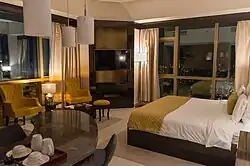 The four-star Gevora Hotel is entered through the lobby on the first floor.[10] The lobby is decorated using marble and gold-colored elements.[17] The Guinness World Records plaque stating that Gevora Hotel is the tallest hotel is displayed in the lobby as well.[18] The 528 rooms are located above the lobby.[11] The smallest rooms are the 232 double rooms with a size of 500 sq ft (46 m2).[10][19] Larger are the one-bedroom suites, of which there are 264, with their size of 670 sq ft (62 m2).[20][21] The 32 suites with two bedrooms occupy 910 sq ft (85 m2) each.[10][21]