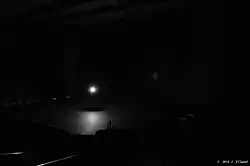 A ghost light is an electric light that is left energised on the stage of a theatre when the theatre is unoccupied and would otherwise be completely dark. Typically, it consists of an exposed incandescent bulb, CFL lamp, or LED lamp mounted in a wire cage on a portable light stand.[1] It is usually placed near centre stage. Ghost lights are also sometimes known as equity lights or equity lamps, possibly indicating their use was originally mandated by the Actors' Equity Association, or Equity.[2][3]