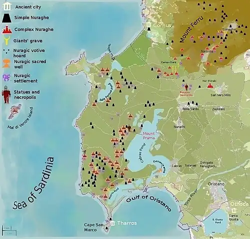 In this timeframe the Sinis peninsula – and the entire Gulf of Oristano as well – was an important economical and commercial area, a fact well-attested by the high concentration of Nuragic monuments: at least 106 are officially recorded, comprising giants' graves (Tumbas de sos zigantes in Sardinian), sacred wells and nuraghes.[36][40][41] During the blooming Nuragic period, this number must have been much higher, given that the intense agricultural works have led, in the course of centuries, to the dismantling of several monuments.[34]