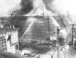 The school auditorium, ten classrooms, and locker rooms were destroyed by fire that swept through the O'Farrell Street wing at Scott Street the morning of August 19, 1934. Eleven firemen were injured, some of them trapped under a falling ceiling. The fire was blamed on sparks from a worker's blowtorch during work on the building, which was surrounded by scaffolding.[12]