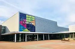 The Community Campus includes an incorporated public library, a video studio, a 900-seat theater with balcony, and a blackbox. It also sports two gymnasiums, the main gym and a smaller auxiliary gym, softball and baseball fields and a new multi-purpose stadium with Field Turf, named "Bob Commings Field". The stadium enhancements are being funded privately through community support. Design of permanent facilities within the stadium were completed in 2008 and an outdoor learning lab is being built near the main retention pond. An adjacent property was bought by Plain Township to be converted to a park, and walking trails from the park will wind through the campus.