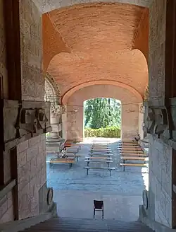 On this front one can recognise the basement, marked by walls made of bare stone limestonea and large circular windows with grilles, which houses the rooms reserved for staff (kitchens, laundries, dormitories, etc.). In the centre of the rear façade is a majestic stone portico, leaning towards the Varese valley, which supports the ballroom and under which is the secondary entrance to the building. According to the original plan, this structure was to have been the arrival station of the funicular, but the idea was later abandoned due to the excessive noise of the engines.[15] Noteworthy are the decorations carved in stone and cement, the elaborate wrought-iron railings and the doccioni in the shape of a dragon, the work of Alessandro Mazzucotelli and, lastly, the imposing brick vaulting, details that give the portico a mysterious 'Gothic' appearance.
