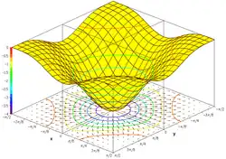 Oftentimes it is helpful to show with the graph, the gradient of the function and several level curves. The level curves can be mapped on the function surface or can be projected on the bottom plane. The second figure shows such a drawing of the graph of the function: