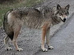 Gray wolves (Canis lupus) migrated from Eurasia into North America 70,000–23,000 years ago and gave rise to at least two morphologically and genetically distinct groups.[4] One group is represented by the extinct Beringian wolf and the other by the modern populations.[5][6] One author proposes that eastern wolves form a distinct clade basal to the coyote clade and Great Plains wolves are the second wolves to cross the Bering land bridge, after Mexican wolves.[3] The Great Lakes wolf likely originated 8,000 BP after ice sheets melted in the Great Lakes region.[7]