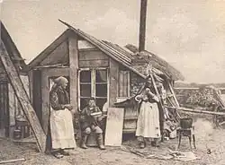 Peasants from a destroyed village in front of a shack constructed from debris, environs of Warsaw, 1915