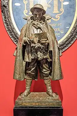 The memorial, also placed on platform 1, consists of an over-life-size bronze statue of a soldier by Jagger, cast by the Thames Ditton Foundry in Surrey. The soldier is dressed in his greatcoat, sheepskin jerkin (a sleeveless undercoat), and scarf, with his helmet pushed back and resting on his shoulders, and reading a letter from home. The sculpture stands on a decorative plinth (pedestal), backed by a screen, which features the badges of the Royal Navy and the Royal Air Force in relief carving. The plinth is in polished Belgian granite except for a band of darker Aberdeen granite, contrasting with the white Portland stone of the screen behind. The stonework was designed by Tait.[22][23][24] A sealed casket, made at the GWR's Swindon Works and bearing the names of the dead, was buried in the plinth. This was in contrast to the approach taken at other war memorials, including the Great Eastern Railway War Memorial at Liverpool Street station across London, where the names are on display on the wall.[25] As part of the war memorial scheme, Tait redesigned the windows and doors in the wall behind the memorial with oak panelling. Jagger carved the GWR's company arms and the royal arms into the wood above the royal waiting room (now the first class lounge).[17][26]