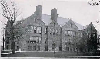 The institution that would become East High School began in 1856 with the construction of Green Bay's Sale School (nicknamed "Old Brick") on land donated to the city by fur trader John Jacob Astor. Sale was the first school built by the Green Bay Area Public School District. The school traces its formal beginnings (celebrating a sesquicentennial in 2011) to a Professor Furber, who added Latin and mathematics to the grade school curriculum in 1860.[2] The first class to receive diplomas, consisting of four men and two women, was the class of 1875.[2] The school moved to a new location on South Webster Avenue in 1893 and its students became known as the Hilltoppers. After the move, "Old Brick" continued to be used by the school district for administrative purposes, and was torn down in 1957.[3] While at the Hilltopper building, the school published a literary magazine called Aeroplane beginning in 1910. The publication's commencement edition served as a pseudo-yearbook, and began printing directories of the whole school in its 1917 edition.[4] The publication was renamed East High Aeroplane in 1924 in anticipation of the school's move to its new location.[5]
