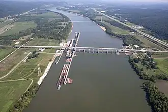 Greenup Lock and Dam is the eleventh lock and dam on the Ohio River, located 341 mi (549 km) downstream of Pittsburgh. There are two locks, one for commercial barge traffic which is 1,200 feet long by 110 feet wide (366 m × 34 m), and the auxiliary lock which is 600 feet long by 110 feet wide (183 m × 34 m).[1]