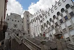 In 1741, the city received the title of “The Most Noble and Loyal City of Santa Fe de Minas de Guanajuato” and became an “intendencia” (province) in 1790 because of the abundance of riches coming from its mines.[6] In the 18th century, it was the world's leading silver extraction center,[13] making it the richest city in Mexico for much of the early colonial period.[14] The production of the La Valenciana mine alone affected the world economy, and made the counts of Valencianas one of the most powerful families in New Spain.[10] The city was one of the richest and most opulent in New Spain in the 18th century. This wealth is manifested in its civil and religious architecture.[6] The colonial architecture includes some of the best Baroque and Churrigueresque examples in the New World—such as the Valenciana, Cata, and La Compañía (Jesuit) Churches, and the Basilica of Our Lady of Guanajuato.[14] Most constructions from this time are of pink or green sandstone. In the churches, the Baroque altars were gilded with gold from local mines.[10] These structures have influenced later buildings throughout central Mexico. According to the UNESCO World Heritage Sites, the La Compañía and La Valenciana churches are considered among the most beautiful examples of Baroque architecture in Central and South America.[13]