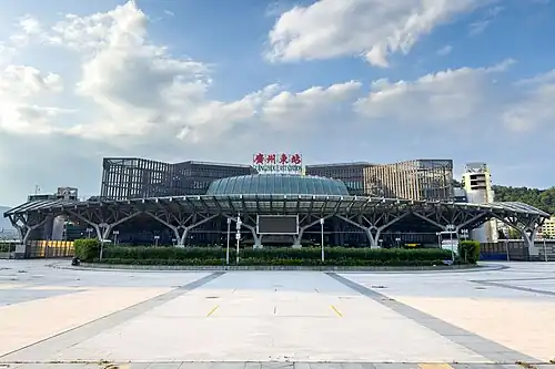 Guangzhoudong (Guangzhou East) railway station (simplified Chinese: 广州东站; traditional Chinese: 廣州東站; Jyutping: gwong2 zau1 dung1 zaam6; Cantonese Yale: Gwóngjāu Dūng Jaahm), formerly known as Tianhe railway station (Chinese: 天河站; Cantonese Yale: Tīnhòh Jaahm) serves the city of Guangzhou, located in the city's Tianhe District.
